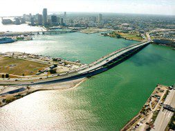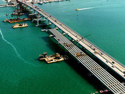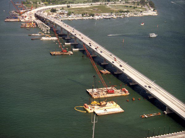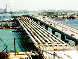 Completed in 1997 by American Bridge, the MacArthur Causeway Bridge project consisted of the construction of twin, 2,467′ 8 5/8″ (northern bridge) and 2,454′ (southern bridge), three-lane bridges with two 10′ shoulders and a 6′ pedestrian/bicycle walkway each. These 18-span AASHTO Bulb “T” bridges replaced the existing MacArthur Causeway. The bridges are super elevated. The project also included 2,838′ of divided roadway approach and demolition of the existing bridge. Work involved installation of 17 foundations13 underwater, which included 78 by 84″ cased drilled shafts, and four land foundations with forty-eight 48″ drilled shafts. Bottom of shaft caps were located 1′ below mean low water (MLW).