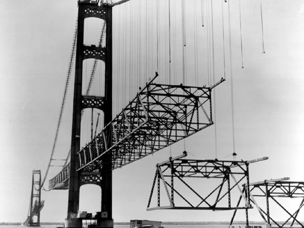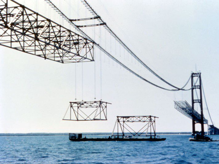 This project represents the fabrication and erection of the Mackinaw City truss approach and the St. Ignace truss and girder approaches to the Mackinac Suspension Bridge. This work included 35 deck truss spans aggregating 10,243′ (3,122m) and 14 girder spans aggregating 700′ (213m). Total weight of structural steel in this portion of the work was 18,188 tons.