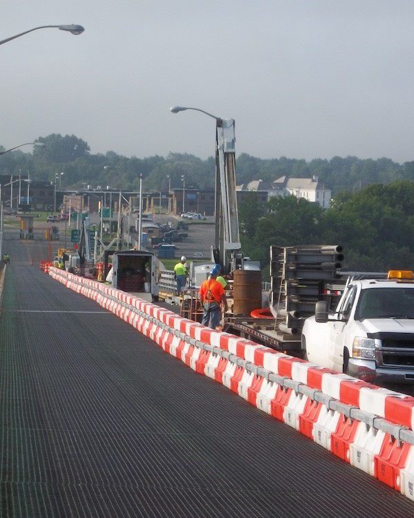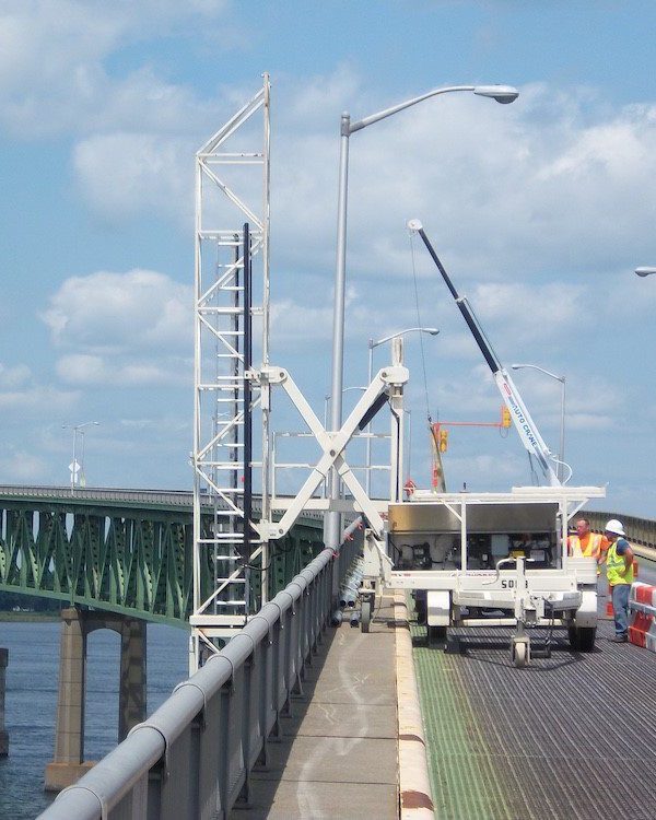 Completed in 2011 by American Bridge, the Ogdensburg-Prescott International Bridge rehabilitation included replacing 70,000 SF of steel grid deck, handrails, roadway lights, and miscellaneous repairs. Work was done under one-lane closures using an overhead gantry system. The bridge was originally built by American Bridge in 1960.