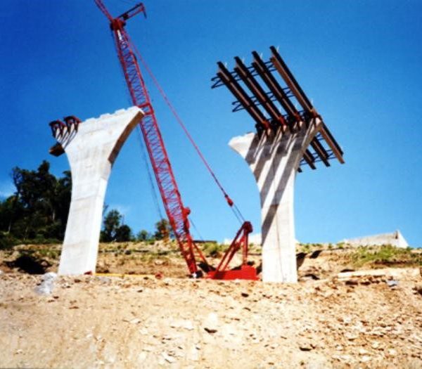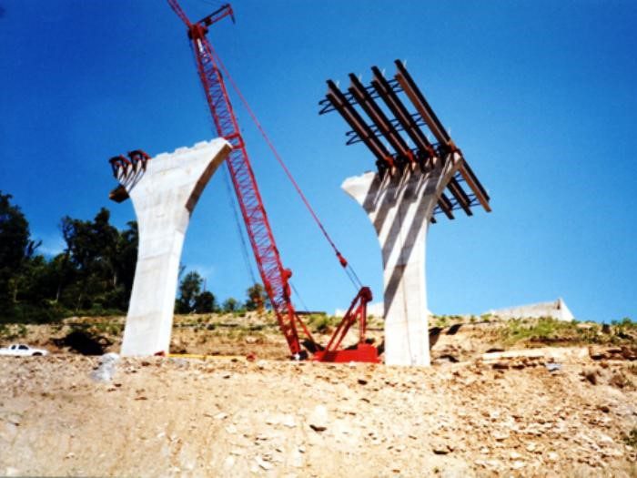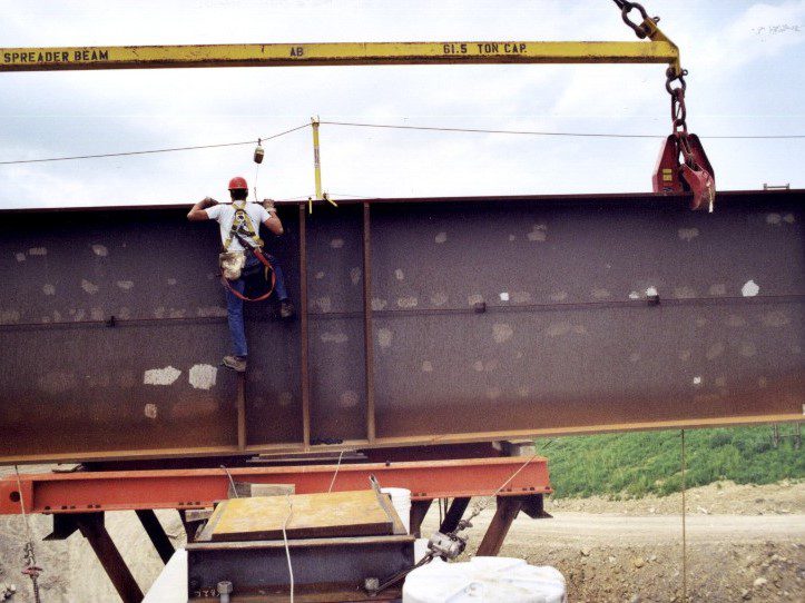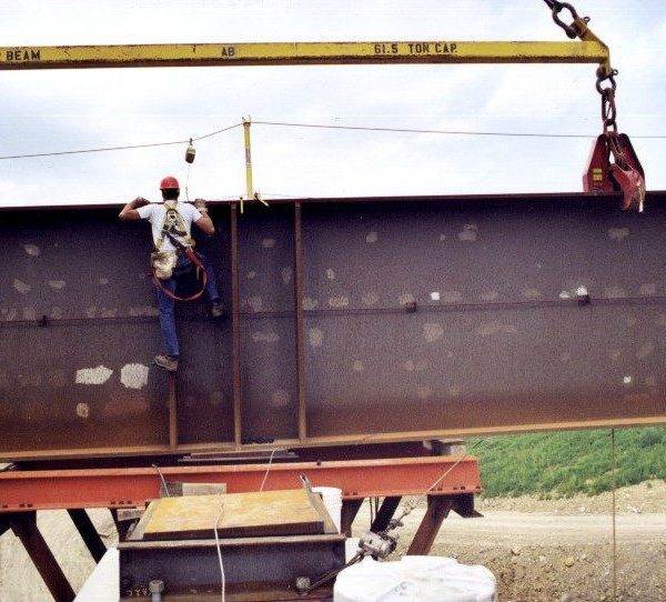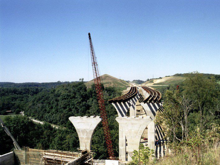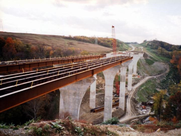 Completed in 1999 by American Bridge, the Mon/Fayette Expressway Bridges project involved erecting two sets of twin steel plate girder bridges: one 6-span (1,333′) and one 8-span curved bridge (1,363′), totaling 6,243′ (1,903 meters). The bridges feature spans up to 265′ (81 meters) and use 80″ and 98″ deep plate girders. The gorge is 207′ (63 meters) deep.
