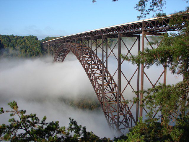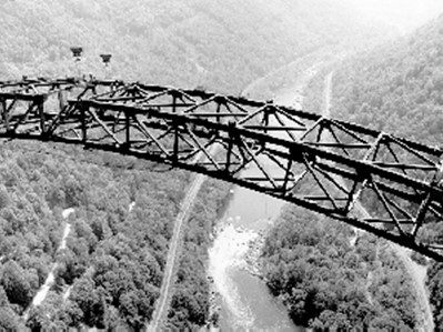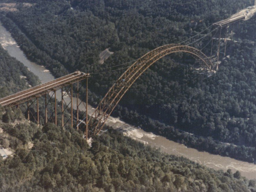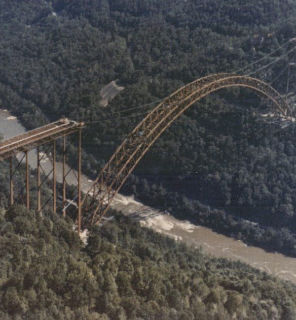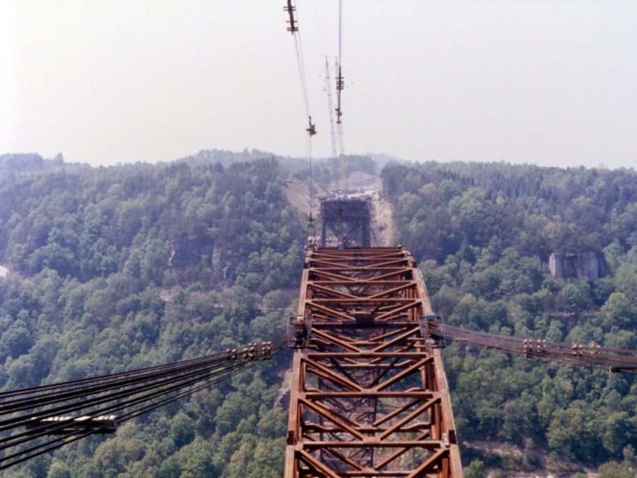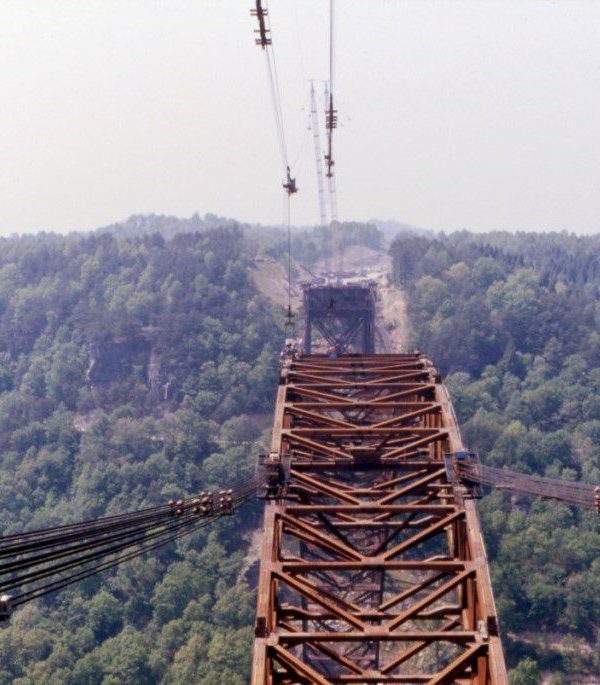 Completed in 1977 by American Bridge, the New River Gorge Bridge project involved temporary works engineering for a 3,030′ (924m) two-hinged deck arch bridge. With a 1,700′ (518m) span, it remains the world’s longest deck arch bridge. The structure rises 900′ (274m) above the river, with a 370′ (113m) arch rise. American Bridge fabricated the weathering steel and developed innovative construction methods, including a four-tower dual cableway crane system spanning 3,500′ (1,067m) and a deck-level tieback system to stabilize the arch. The bridge contains 10,533 tons (9,555mt) of arch steel and 11,470 tons (10,496mt) in the superstructure.