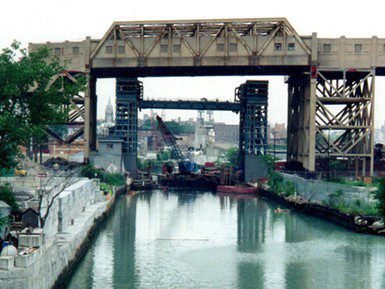 Completed in 1998 by American Bridge, the Ninth Street Bridge project involved fabricating and erecting a high-quality vertical lift bridge to replace a bascule structure. The 80′ long, 47′ wide lift span provides 82′ vertical clearance. The bridge was constructed beneath an active New York City Transit rail line with columns fitted with jacking devices for settlement adjustments. American Bridge designed a cantilevered gantry for erecting 24-ton sheaves and installed synchronized electric motors with redundant systems for operation. The bridge was erected in the up position to allow continued navigation during construction.
