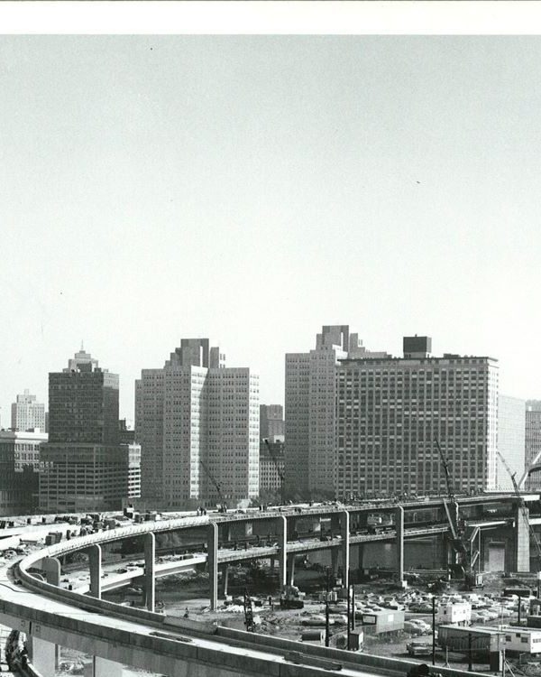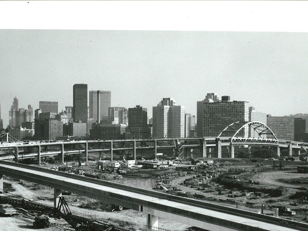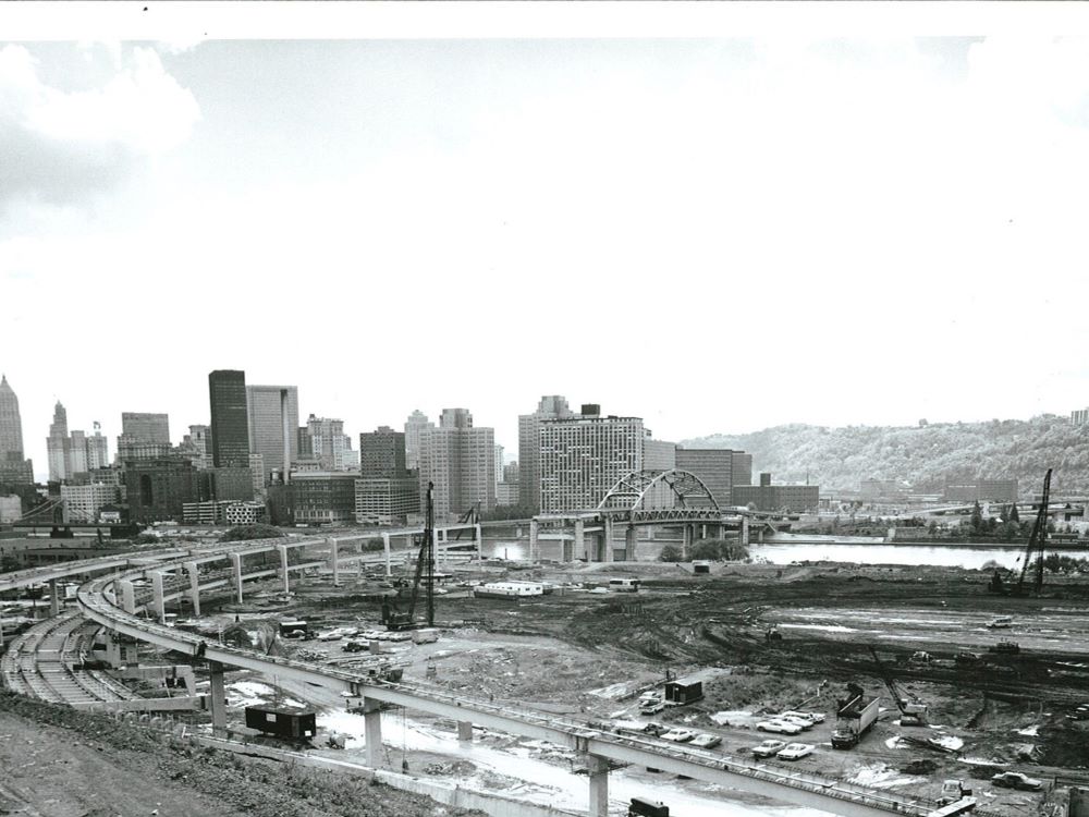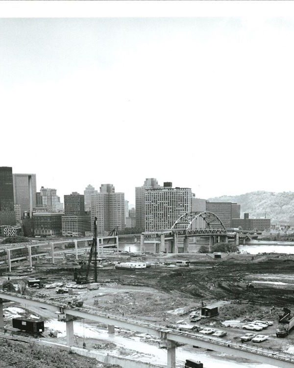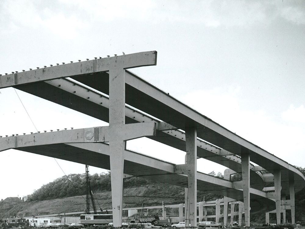 Completed in 1969 by American Bridge the North Approach to Fort Duquesne Bridge project consisted of fabricating and erecting a 45-span, 4,557′ (1,389m) double-deck elevated approach with orthotropic steel box tubs and cantilevered box bents. Total steel weight was 5,656 tons (5,142mt).