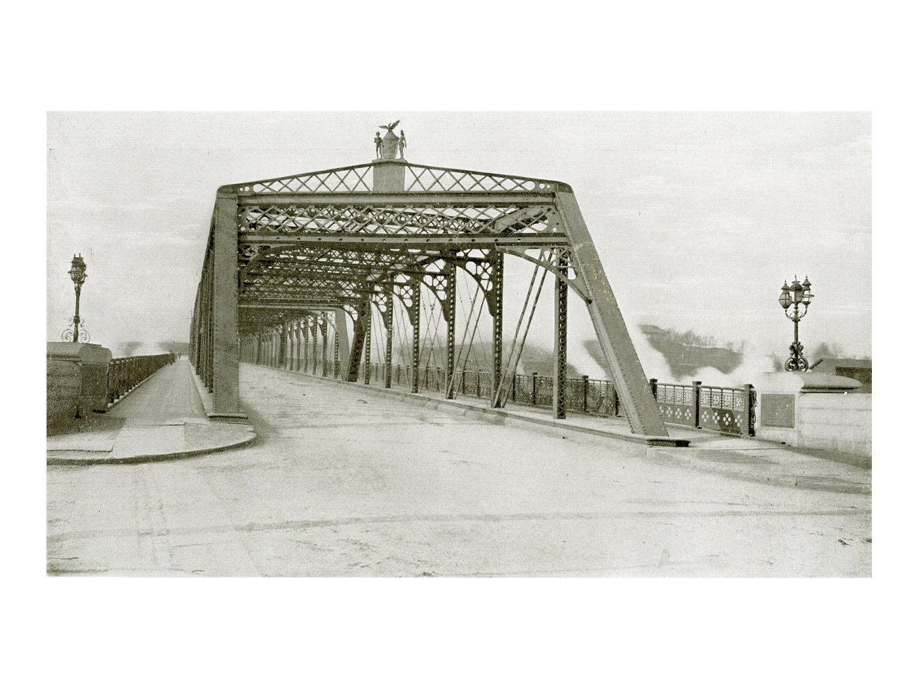 Highway bridge consisting of one through pin-connected span, 123 ft 0-in c-c; one through pin-connected span, 192 ft 0-in c-c; one through pin-connected span, 113 ft 1-in c-c; one through pin-connected span, 109 ft 5.5-in c-c; one deck lattice span, 61 ft 9-in o-o. Width of roadway, 24 ft; two sidewalks, each 8 ft 7-in; asphalt floor on buckle plates. Weight 867 tons.