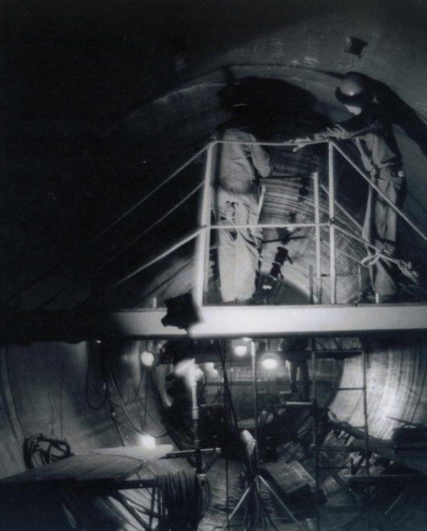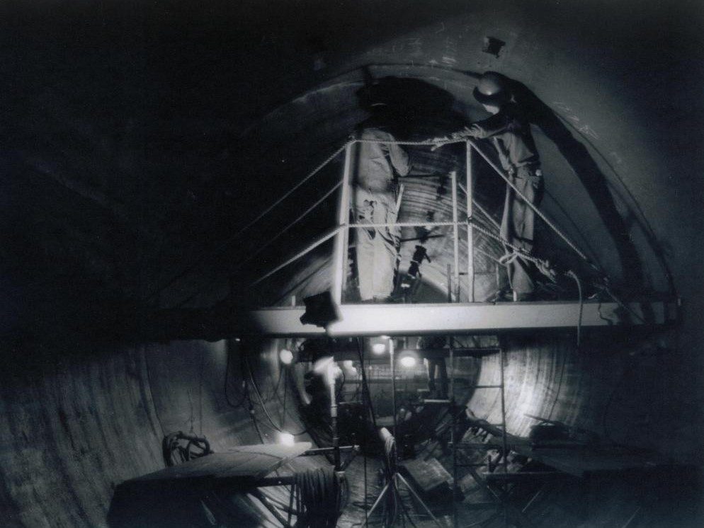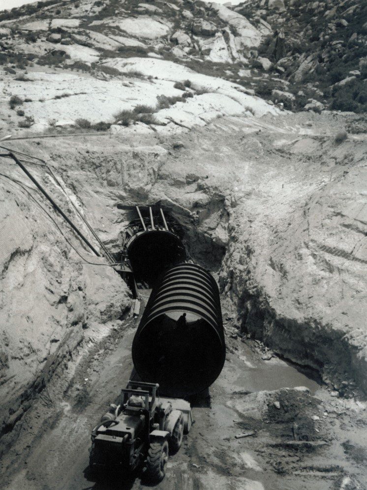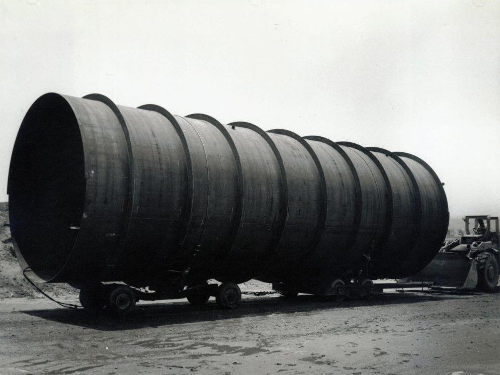 Completed in 1972 by American Bridge, the Perris Dam Tunnel Liner project consisted of fabricating and installing a tunnel liner approximately 12 feet in diameter and 1,600 feet long, placed in a tunnel on a horizontal curve. The sections were shop fabricated, shipped by truck to the site, and erected by American Bridge at the rate of one section per day (five sections per week).This section was shop fabricated and shipped by truck to the site and was erected by ABD at the rate of one section per day (five sections per week).