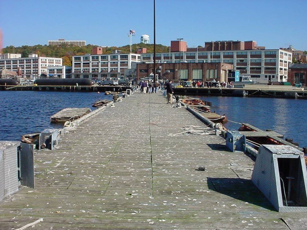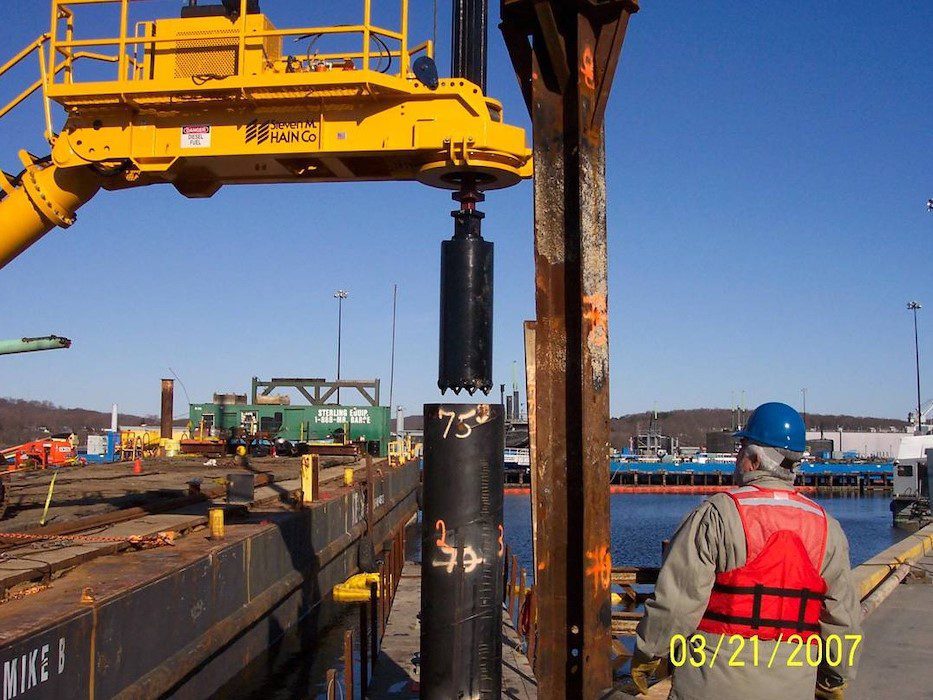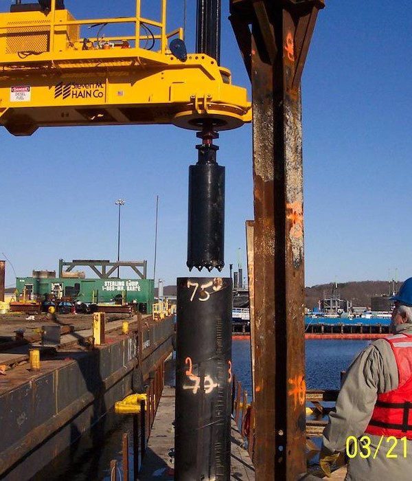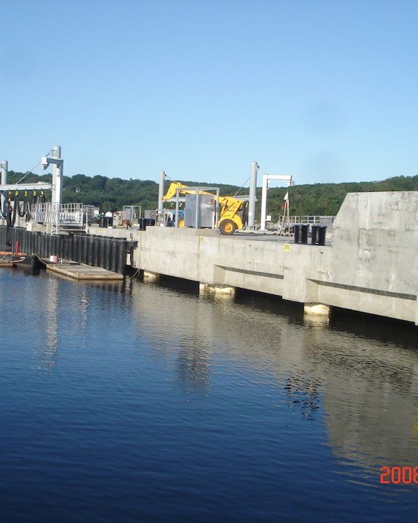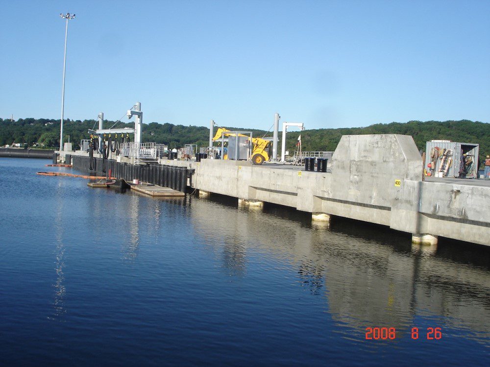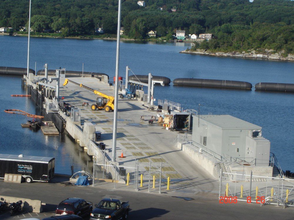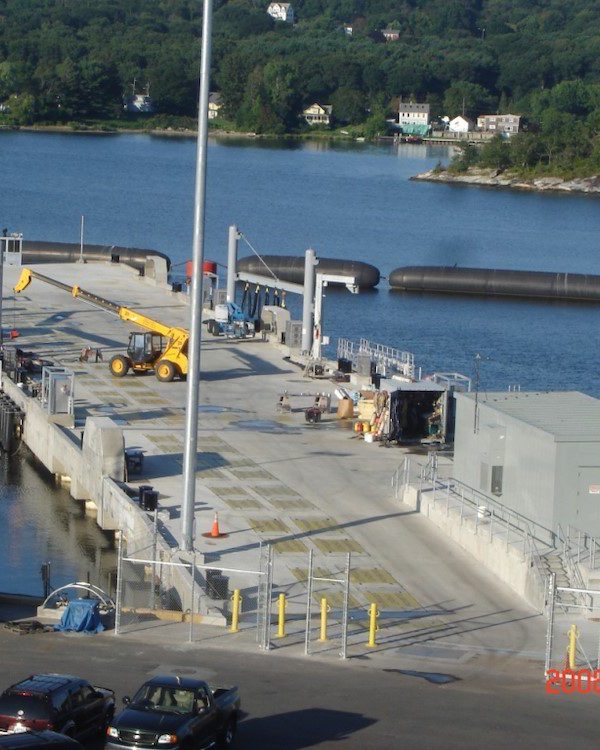 Completed in 2008 by American Bridge, the Pier 6 Replacement project involved demolishing and disposing of piers 4, 6, and 13, along with dredging 373,000 CY of material for disposal in a Confined Aquatic Disposal (CAD) Cell. The new structure, founded on steel pipe piles, includes 70,000 CY of reinforced concrete, bollards, and shore services for new submarines. American Bridge self-performed most of the work, including pile installation and concrete construction.