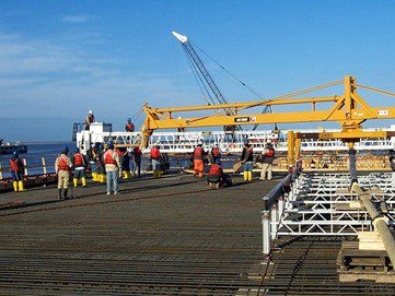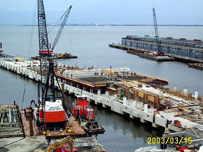 Completed in 2005 by American Bridge, the Pier 7 Naval Station project involved constructing a 456m by 28m double-deck berthing pier supported by 400 concrete cylinder piles. The lower deck is made of precast concrete panels with cast-in-place infill, while the upper deck is supported by cast-in-place columns and beams. The pier includes essential services like shore power, fuel, and water lines. The project also involved constructing 191m of new concrete sheet pile bulkhead, installing fendering systems, and demolishing two old berthing piers, removing 400,000 cubic meters of material.