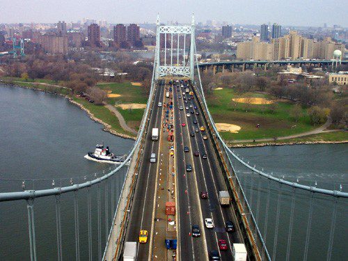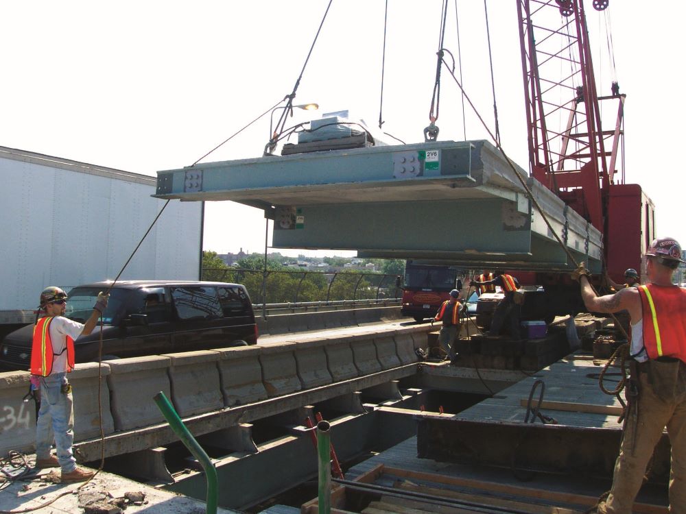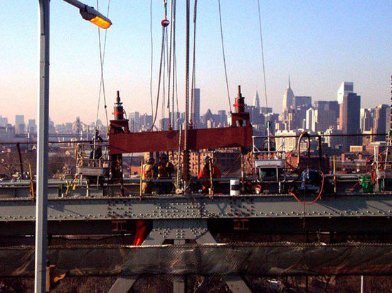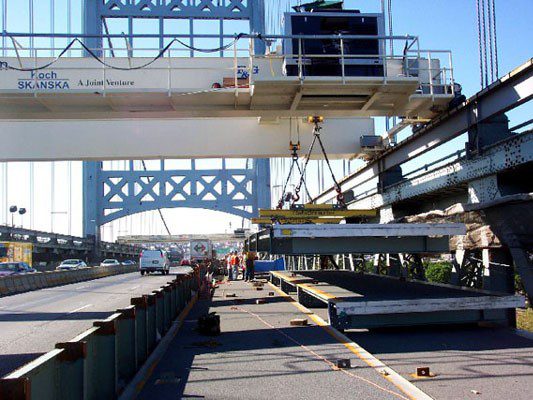 Completed in 2004 by American Bridge, the RFK Triborough Bridge Rehabilitation/Deck Replacement project involved re-decking the 2,723’ suspension bridge with orthotropic panels and the 1,568’ Queens Viaduct with precast concrete panels. The project also included replacing 184 pairs of suspender ropes, widening the Queens Viaduct, and transferring the suspension bridge’s load to new hanger ropes. The deck was replaced using AB’s scissor jack method to minimize temporary loads. Additional work included replacing expansion joints, tightening cable band bolts, installing seismic restrainers, and adding new barriers.