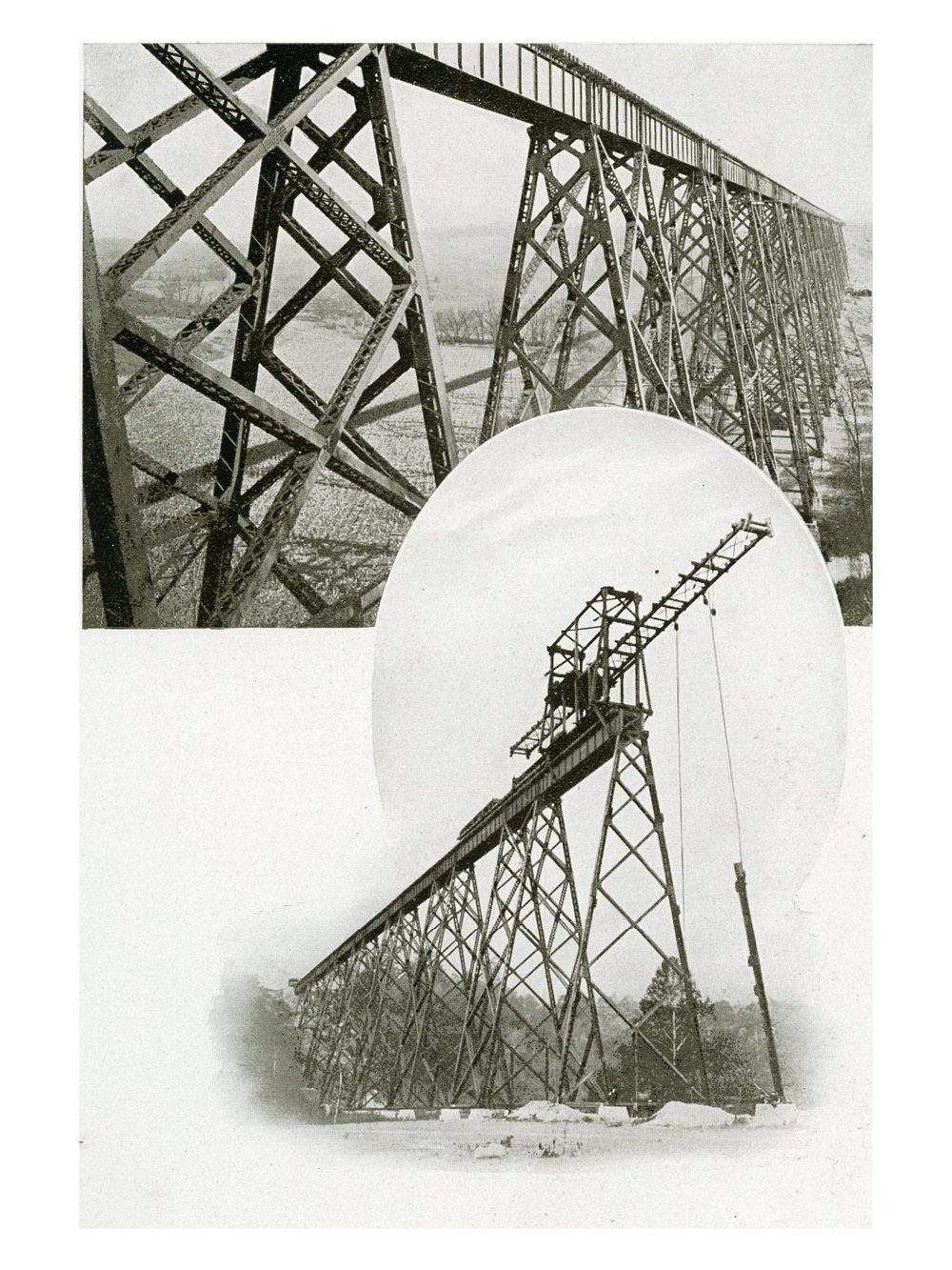 Total length 2,000 ft, consisting of 69 plate-girder spans. Maximum height 175 ft; alignment, square. Weight 2,750 tons. It was built in 1906 and stretches across the Richland Creek Valley in Greene County, Indiana. When the Tulip Trestle was originally built, it was ranked the longest rail trestle in the U.S. and the third-longest in the world.