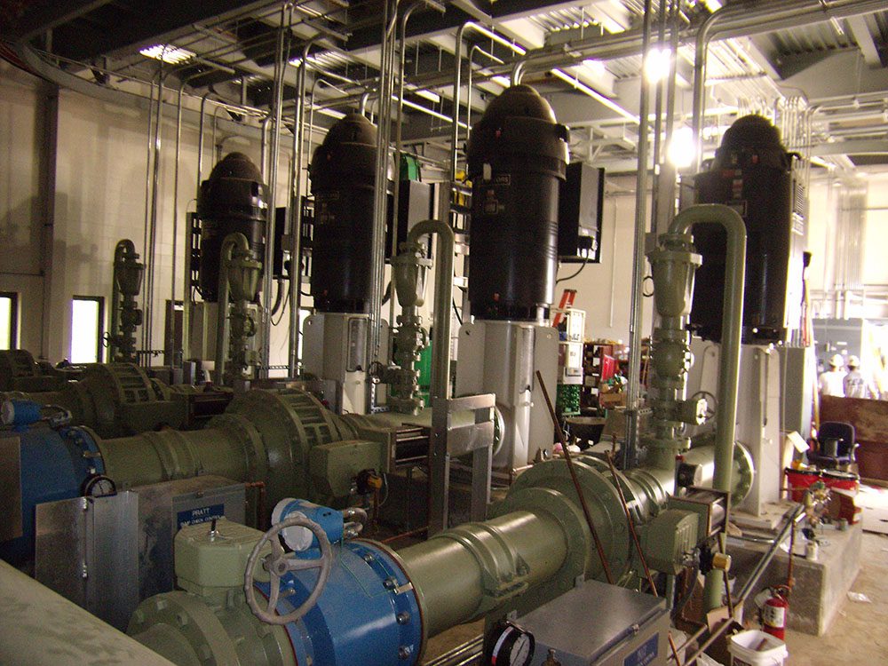 The four collector wells were constructed using 13-foot diameter concrete caissons installed along the bank of the Ohio River, with horizontal wells placed at the bottom of the caissons. These wells were connected to the tunnel below by a drilled drop shaft. Blasting methods were used to excavate the starter tunnel, while the remainder of the tunnel was excavated using a 12-foot diameter Robbins Main Beam Tunnel Boring Machine (TBM) through limestone and shale at depths ranging from 150 to 155 feet. Initial support for the tunnel consisted of rock dowels and channels, and the final lining was a 10-foot diameter monolithic unreinforced, cast-in-place concrete. Additionally, a 65 MGD pumping station was constructed above the work shaft.