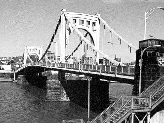 Completed in 1928 by American Bridge, the Roberto Clemente Bridge (Sixth Street Bridge) is one of the ‘Three Sisters’—self-anchored, eye-bar suspension bridges, along with the 7th and 9th Street Bridges. Its suspension system features 14″ eye-bars with pins atop each tower, supporting the roadway via 4″ eye-bar suspenders. The stiffening system includes triple web plate girders. American Bridge fabricated and erected all three bridges, using an innovative truss conversion method to enable balanced cantilever erection without river falsework.