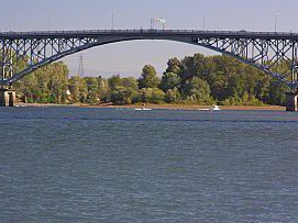 Completed in 1926 by American Bridge, the Ross Island Bridge project consisted of a cantilevered deck truss, seven-span crossing of the Willamette River, including six 321′ deck truss spans and one 535′ arch span.