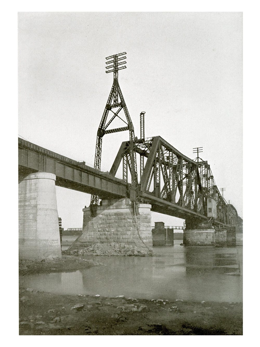 Consisting of the following single-track through pin spans: One fixed span, 161 ft 3-in c-c.; four fixed spans each 215 ft 0-in c-c.; one fixed span, 235 ft 9-in c-c.; one draw span, 360 ft 0-in c-c. Weight 2671 tons.