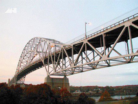 Completed in 1935 by American Bridge, the Sagamore Bridge project consisted of one of two nearly identical arch truss bridges fabricated and constructed simultaneously by American Bridge over the Cape Cod Canal (the other was the Bourne Bridge). American Bridge’s scope of work included the three-span 1,408′ main bridge, including the 616′ main span. The weight of structural steel was 5,025 tons.