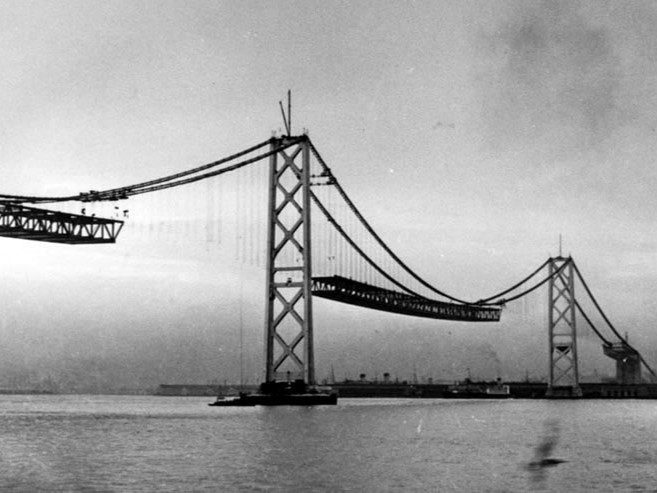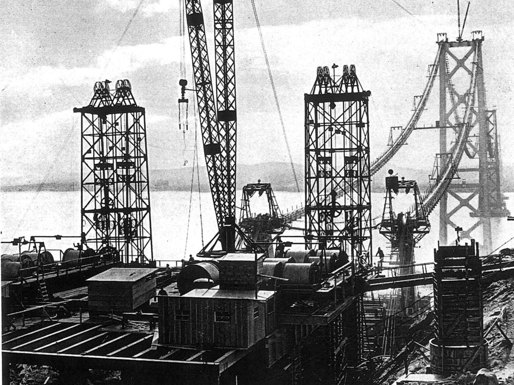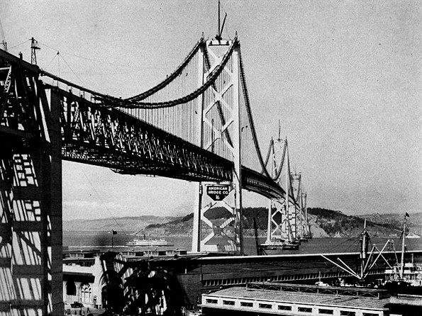 Completed in 1936 by American Bridge, the San Francisco – Oakland Bay Bridge – East and West Spans project consisted of the prime superstructure contract for this 22,000’ (6,800m) crossing of the San Francisco Bay. The work included two back-to-back suspension bridges, a major cantilevered truss, and many approach spans. American Bridge erected a total of 167,100 tons (152,000mt) of structural steel for the project, including 19,100 tons (17,300mt) of airspun main cables. The two suspension bridges span the west portion of the bay, between San Francisco and Yerba Buena Island. These bridges have a suspended length of 9,271’ (2,825m) and have four steel towers rising to a height of 515’ (157m). The cables were airspun in 37 strands of 472 wires each, pulled in two loops. There is a total of 21,465’ (6,500m) of main cable, and 1,192 bridge rope suspenders. The cantilevered truss and approaches span the east portion of the bay, from Yerba Buena Island to Oakland. This section consists of a three-span cantilevered truss of 508’+1400’+512’ (154m+427m+156m), five spans of 509’ (155m) trusses, 14 spans of 288’ (88m) trusses, plus a four-span curved truss at Yerba Buena Island. Both bridges are double-deck from start to finish, enabling the transit of 12 lanes of traffic – six on the upper deck and six on the lower. The work was started on July 1, 1932, and completed on November 1, 1936.