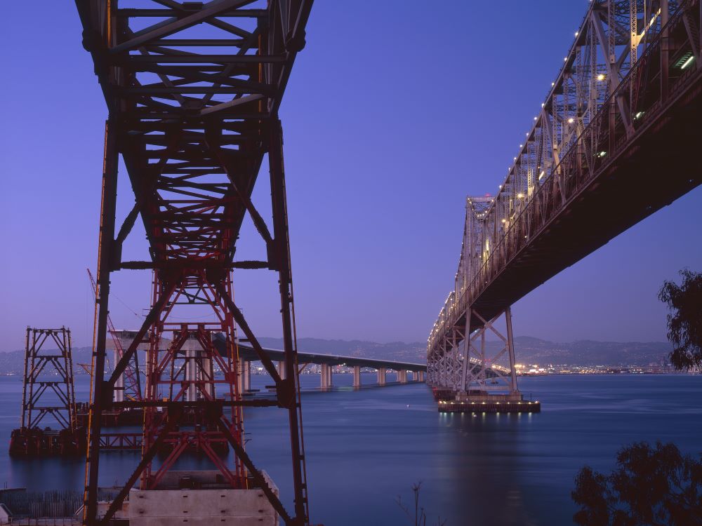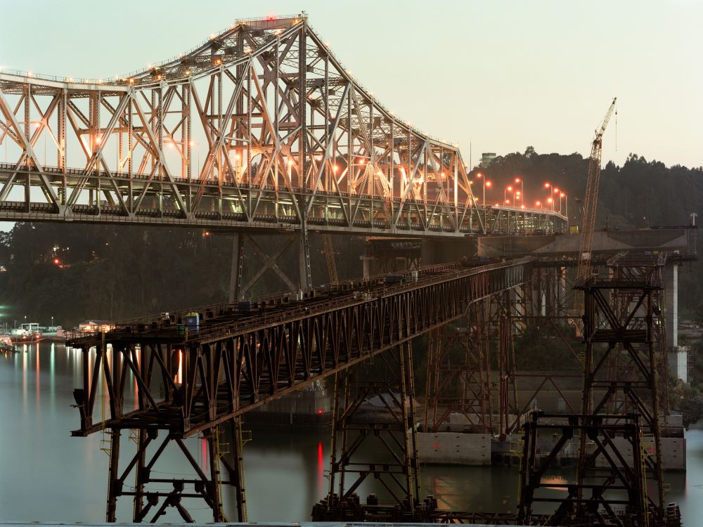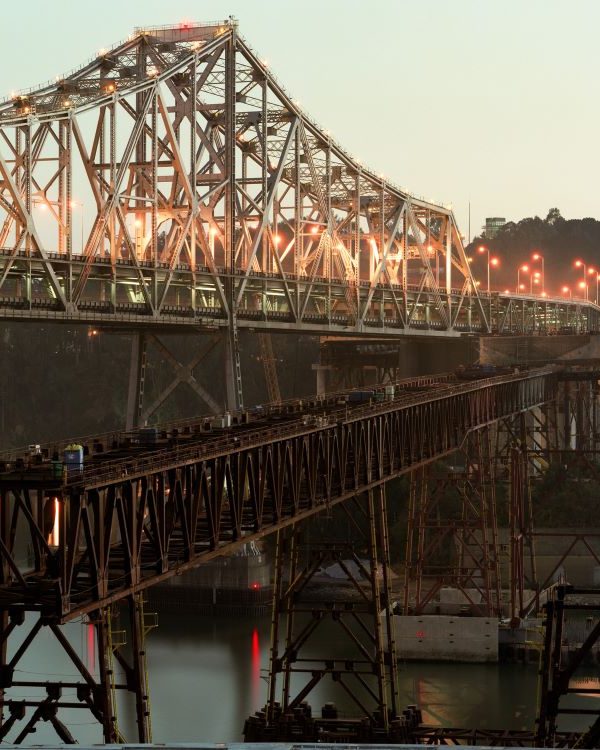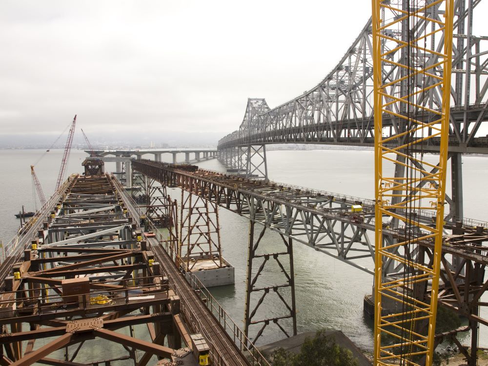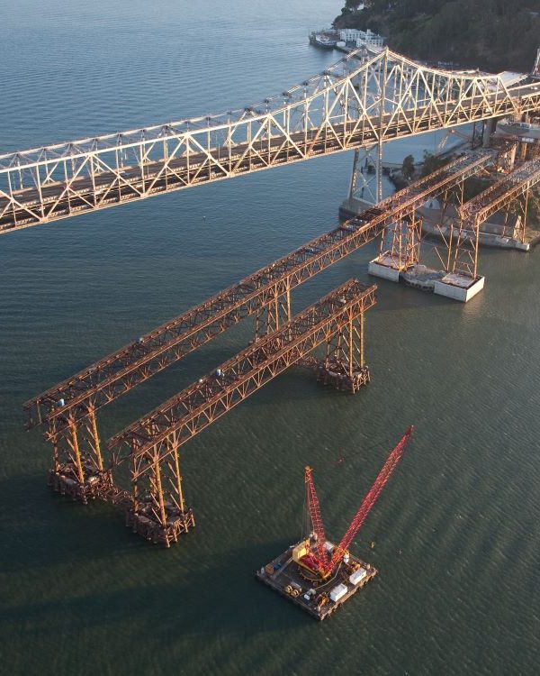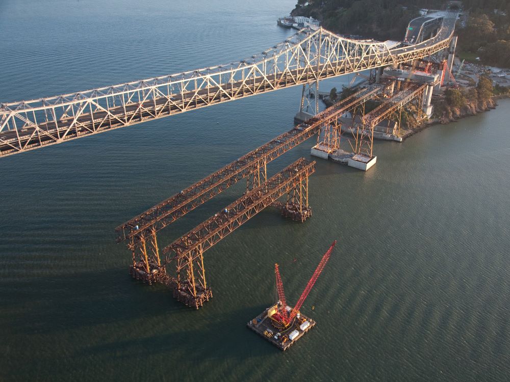 Completed in 2009 by American Bridge, the SAS Temporary Works project consisted of the design and construction of twin 607.5m eight-span truss bridges and a 160m erection tower. The temporary bridges were used to receive, launch, align, and support the permanent twin orthotropic box girder (OBG) superstructure to allow the main bridge cable to be anchored in its deck. After completion of the main and suspender cables, ABFJV transferred the load of the permanent superstructure from the temporary bridge to the new bridges cable suspension system. The 160m erection tower functioned as a gantry to lift and place permanent steel tower segments weighing up to 1,100mt. The project included approximately 25,000mt of fabricated structural steel and had a value of about $325M, including removal. Design engineer: American Bridge Engineering/Klohn Crippen Berger.