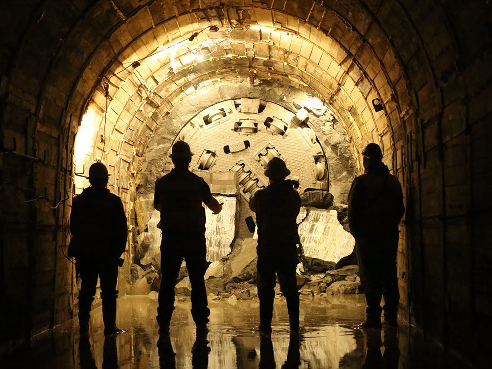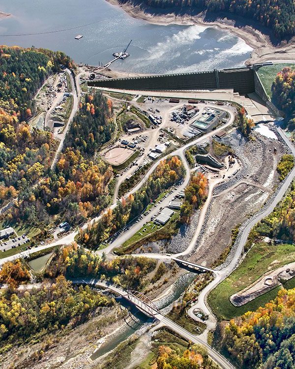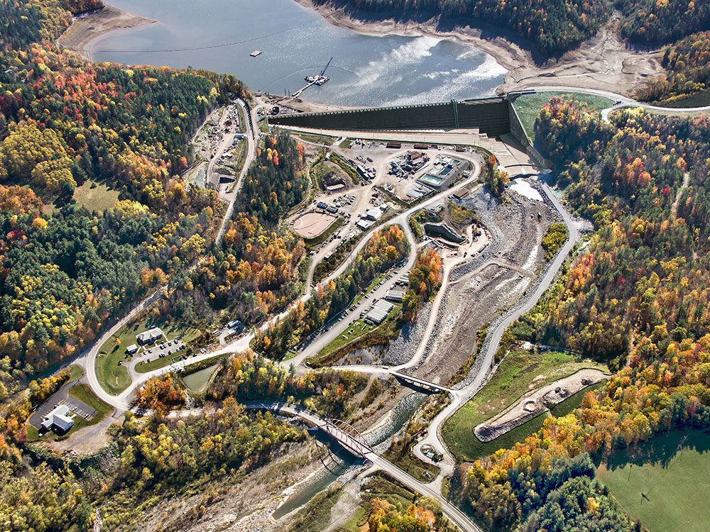 Completed in 2024 by Southland Contracting, the Schoharie Reservoir Low Level Outlet Project was a joint venture between Southland Contracting, Inc. and Oscar Renda Contracting, Inc. Southlands scope of work included construction of microtunnel and deep shafts. The MTBM excavated tunnel is located in Gilboa, New York. Excavation primarily consisted of: 2,210 ft of 9.5 ft ID microtunnel with Permalok casing, 46 ft-diameter, 187 ft-deep Gate Shaft excavated by drill and blast. Land leg tunnel: 1,200 ft of 9.5 ft-diameter tunnel between the Gate Shaft and a Portal. The Water leg tunnel: 1,010ft of 9.5 ft-diameter tunnel with underwater retrieval in the Schoharie Reservoir. A portion of the land leg excavated with SEM (Sequential Excavation Methods) near the portal The tunnel was designed for 150 ft of hydrostatic pressure; bulkheads were designed to prevent uncontrollable emptying of the reservoir. For construction, a new MTBM (microtunnel boring machine) was required for Class 1 Division 2, the first of its kind, and be capable of hyperbaric interventions as well as wet retrieval. The project was constructed in both hard fractured rock and soft ground with cobbles. The rock was primarily sandstone with average compressive strengths of 27,000PSI and very abrasive; cerchar abrasivity index of greater than 6.5 in areas. Portions of mixed face and soft ground in both tunnels with a large quantity of cobbles and boulders embedded within the soil mass. Boulders greater than 10 feet in diameter and numerous smaller boulders and cobbles were encountered. The tunnel was excavated with water pressure up to 5 bar with underwater retrieval from bottom of reservoir at depth of 160 feet. The shaft was supported with liner plate and ribs though the overburden and 10-ft rock-bolts on a 5×5 diamond pattern with mesh and shotcrete in the rock portion of the shaft. The pre-excavation grouting program-controlled groundwater along with a robust pumping system. Both hydraulic and mechanical dredging was used to excavate approximately 10,000 cy of material from the bottom of the reservoir and a 35 ft diameter cofferdam installed at the bottom of the reservoir to retrieve the MTBM and make the underwater connection for the intake. Approximately 5000 cubic yards of tremie concrete were placed around and within the intake to secure it in place. Divers welded the intake to the tunnel pipe and positioned a stainless-steel grating around the 14 ft diameter intake. Additional site work includes the construction of the outlet works near Schoharie Creek, creek restoration that was damaged by hurricane Irene, a Roller Compacted berm adjacent to the existing spillway and construction of a new public overlook adjacent to the dam. Instrumentation and Controls as well as security measures will ensure the supply and safety of this important piece of NYCs drinking water for generations to come. A significant restoration and landscaping package finalizes the work on this contract. Southland Contracting and Oscar Renda self-performed all major work on the project as described above as well as the large diameter mechanical piping and valves, 78 inch knife gate and fixed cone valves as well as the 10 ft roller gates in the Gate Shaft. Due to the remote location, an onsite batch plant was used for all the concrete. The separation plant for tunneling operations was enclosed from the weather.
