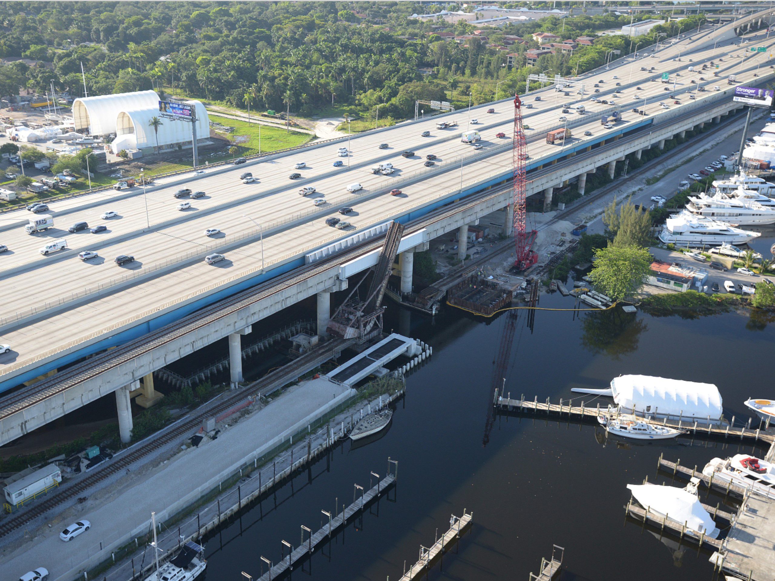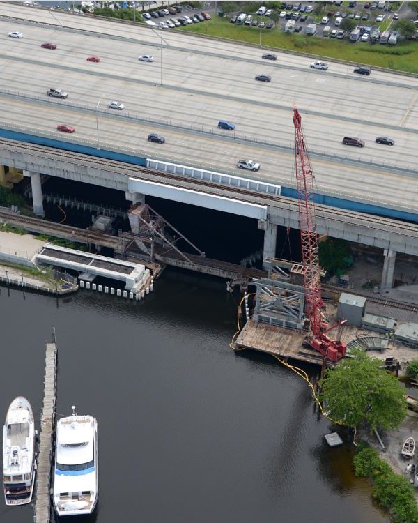 Completed in 2017, the South Florida Rail Corridor CSX Railroad, Over S Fork of the New River project consisted of constructing a bascule bridge that is a Four-Leaf Trunnion and Hydraulic Drive System bridge. This bridge was ranked #6 of Top 10 Bridges in Construction in 2007 by Roads & Bridges Magazine. Johnson Bros. received the maximum early completion incentive bonus allowed by Contract. This award-winning project received the ABC Florida Gulf Coast Chapter Excellence in Construction Public Works award for projects over $20 M. This project also won the FTBA Best in Construction Major Bridge Award. During this time the project team responded to an Emergency Repair Project for I-375 in St. Petersburg, FL and replaced 5 spans of a damaged bridge in 19 days. Responsibilities: Oversee all project administration and coordination.