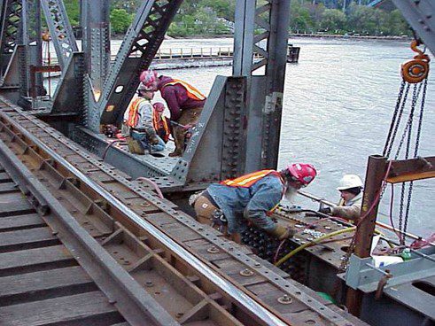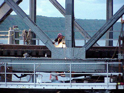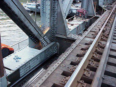 Completed in 2003 by American Bridge, the Spuyten-Duyvil Bridge Emergency Repairs No. 2 project involved repairing a swingspan bridge hit by a barge. Temporary tie rods and weldments were installed, and the bridge was jacked vertically and horizontally to reset it on the roller rim plate. Later, a new drive shaft was installed, and 25′ of truss bottom chord and 8′ of diagonal were replaced.