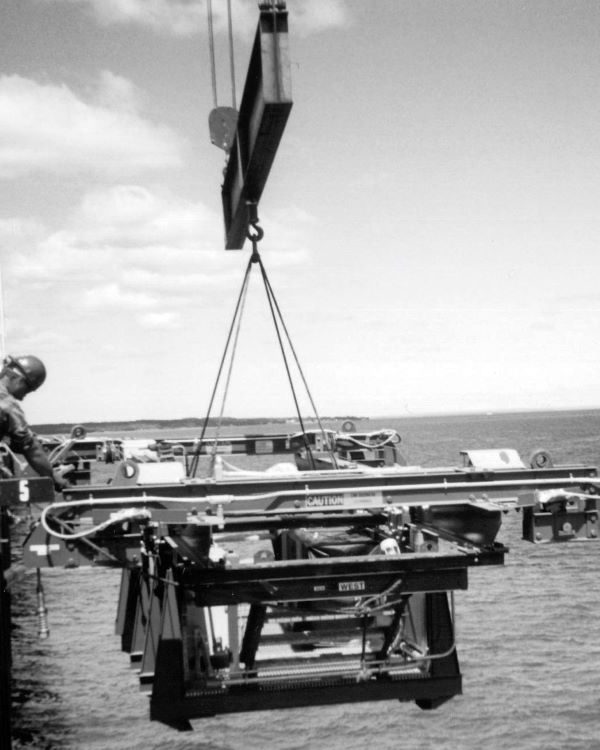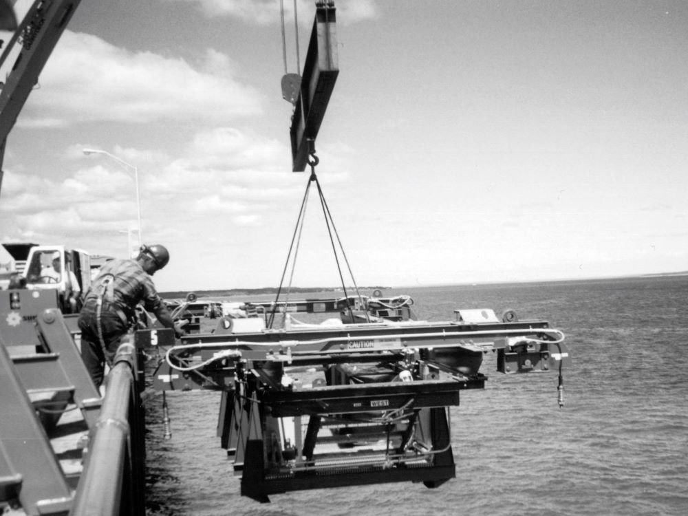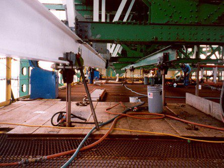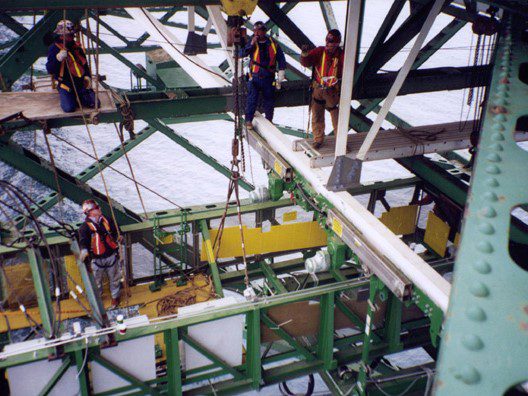 Completed in 2001 by American Bridge, the Straits of Mackinac Bridge Traveler Replacement project involved replacing the inspection traveler vehicles and 7,400′ of railway system on this 21,000′ bridge. Work included removing six traveler vehicles, replacing 14,800′ of traveler rail in the suspended spans, and installing eight new self-propelled electric inspection vehicles. The new system featured advanced electric and hydraulic drive mechanisms with tight deflection and tolerance controls. American Bridge was the general contractor and handled rail fabrication and vehicle erection.