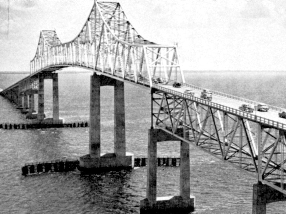 Completed in 1954 by American Bridge, the Sunshine Skyway (1st Cantilevered Truss) project involved fabricating and erecting a 5,621 long, 31-span bridge, including deck girder spans, deck truss spans, and a three-span cantilevered through truss. The bridge was demolished after being struck by a freighter in 1980 and replaced by a cable-stay bridge in 1987.