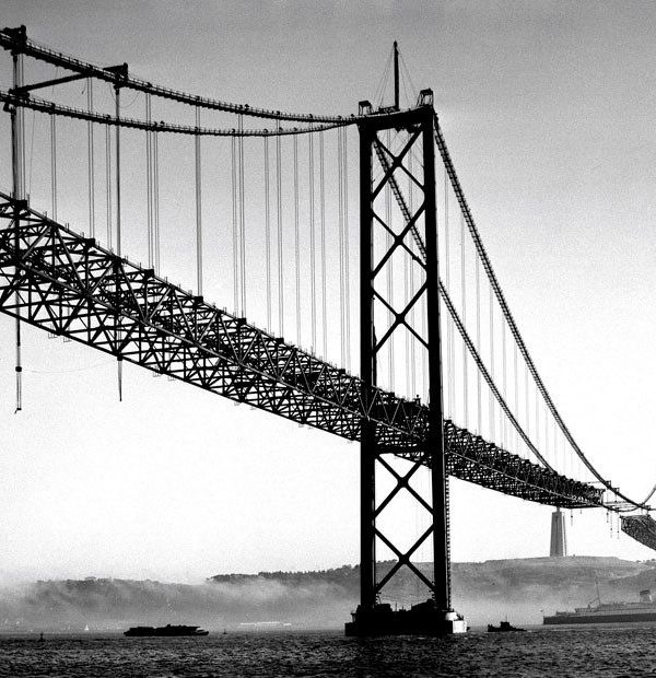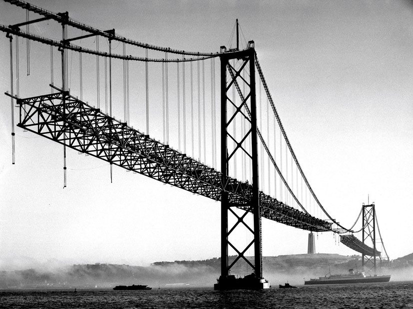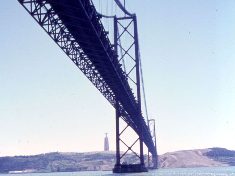 Completed in 1966 by American Bridge, the Tagus River Bridge – Road Deck project consisted of the financing, design, and construction of a 10,573′ (3,223m) crossing of the Tagus River near its mouth at the Atlantic Ocean. The project included a 14-span, 3,100′ (945m) cast-in-place concrete viaduct over Lisbon’s Alcantara District and a six-span, 7,474′ (2,278m) steel truss bridge over the river. Undertaken by a consortium led by USSI (a United States Steel unit that included American Bridge), the viaduct was designed by Tudor Engineering and built by SOPOL. American Bridge and Morrison Knudsen handled the steel bridge, with MK responsible for foundations and anchorages, and American Bridge for the superstructure. The steel design was subcontracted to Steinman (now Parsons). The six-span continuous truss (7,466’ / 2,276m) included a 3,323’ (1,013m) mainspan and three backstay spans of 324’ (99m). The 588’ (179m) towers, cable bents, and anchorage steelwork (15,822 tons) were fabricated at American Bridge’s Ambridge Plant. Saddles were made by Blaw-Knox; cable bands by U.S. Steel Johnstown; and 9,880 tons of wire and cable by U.S. Steel’s Wire Division. Stiffening and floorbeam trusses (13,741 tons) were fabricated by SOREFAME; truss cross bracing (2,510 tons) by American Bridge’s Trenton, NJ plant. Total structural steel weight was 52,422 tons (47,556mt). All steel and cables were erected by American Bridge. Suspended span trusses were preassembled on a 16-acre site in Lisbon and floated into position, while backstay trusses were erected in place with stiffleg travelers. The project duration from start to opening was 1,988 days (65½ months), with 1,370 days (45 months) of field construction.