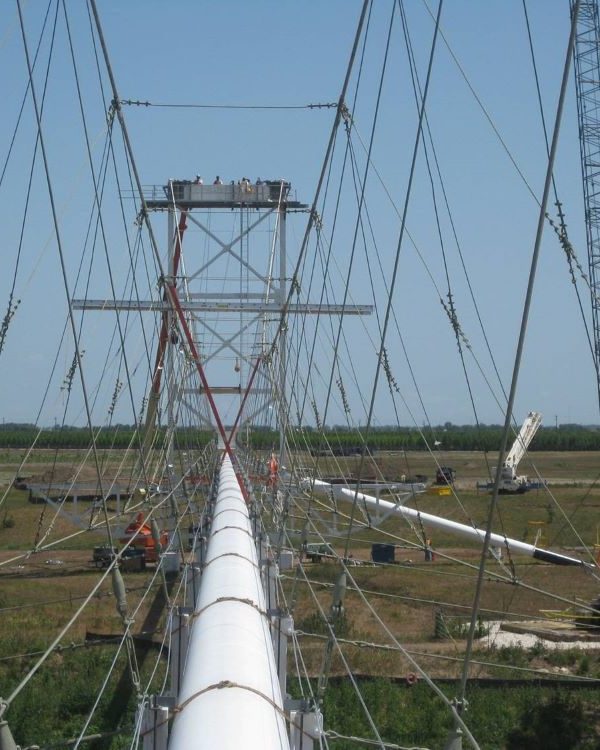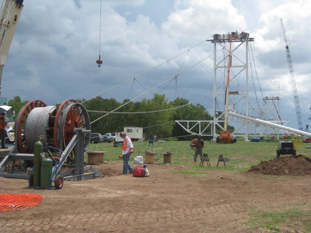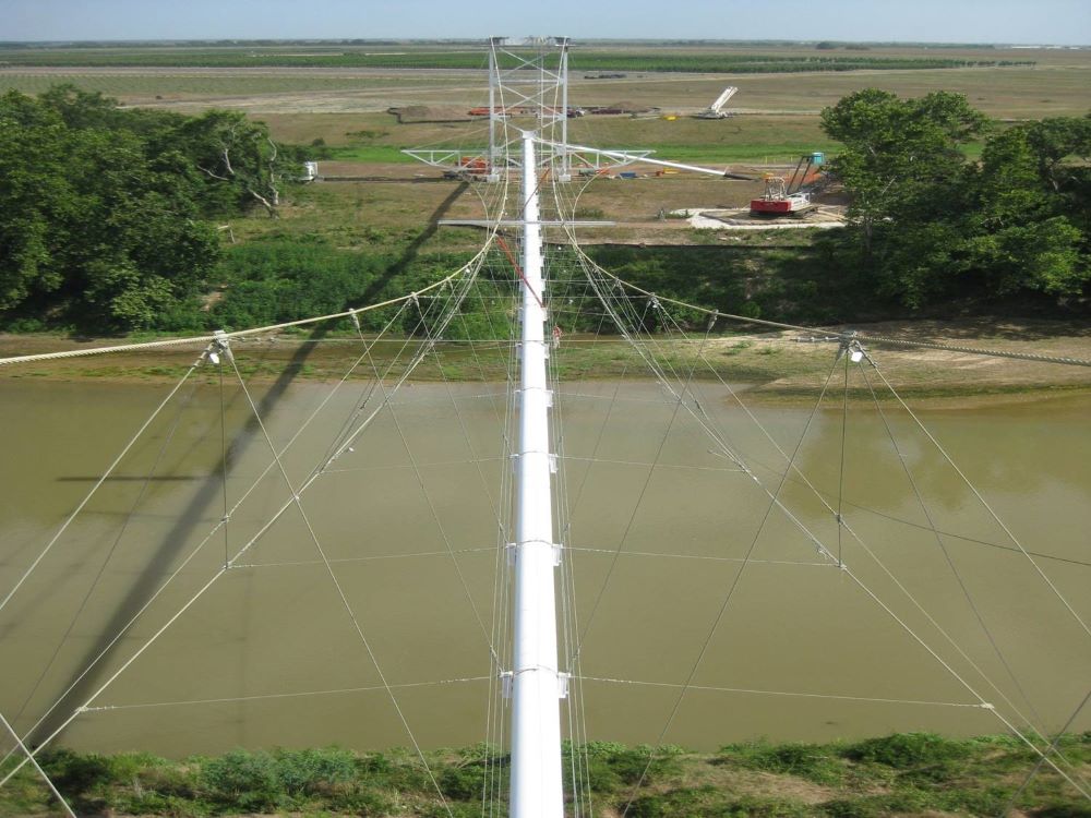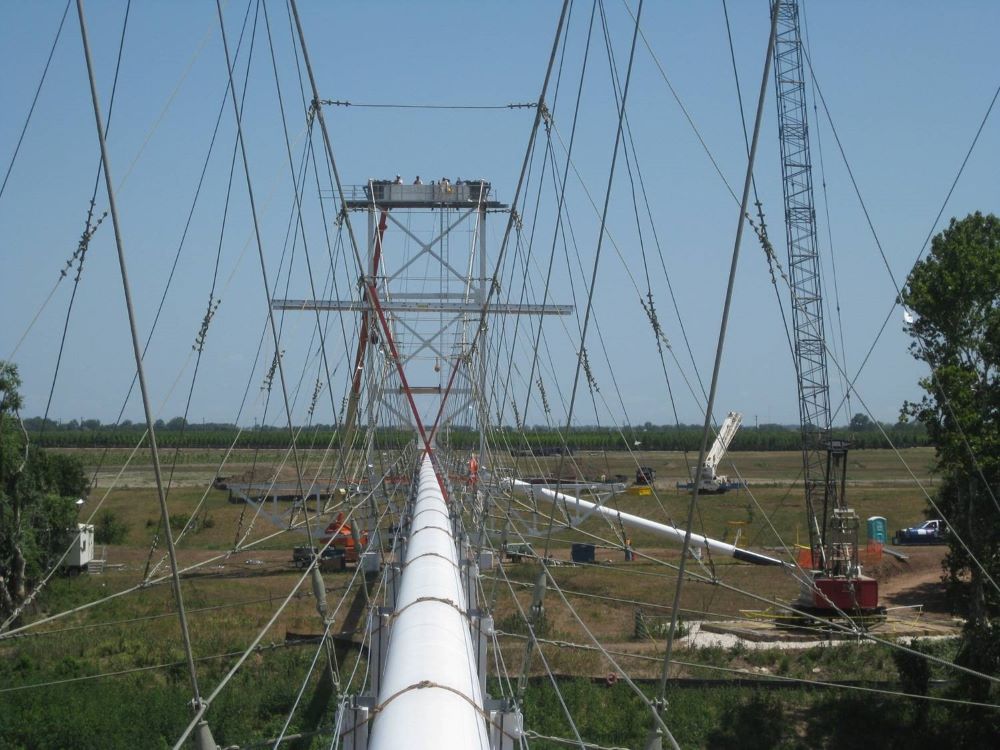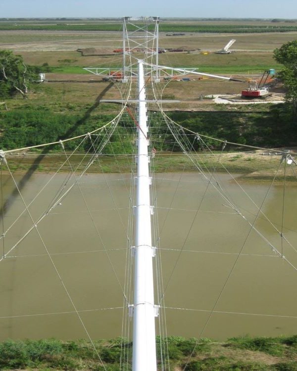 Completed in 2010 by American Bridge, the Williams Pipeline Bridges project involved replacing the main and suspender cables, saddles, and anchorages on two gas pipeline suspension bridges. The Colorado River Bridge has a 550′ main span, and the Brazos River Bridge has a 750′ main span. Structural modifications to towers and anchorages were made to support the new system, and the natural gas pipeline remained pressurized at 750-800 psi during the work.